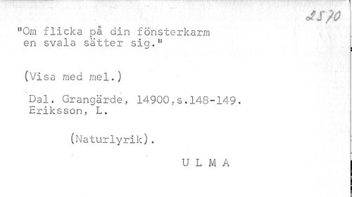 //// jspo //// "Om flicka på din fönsterkarm en svala sätter sia." //// i //// (Visa med mel.) //// Dal. Grangärde, 14900,s.148-149• //// Eriksson, L. //// (Naturlyrik). //// U L M A ////