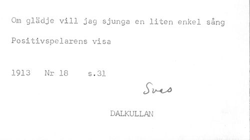 //// Om glädje vill jag sjunga en liten enkel sång Positivspelarens visa //// 1913 Nr 18 s.31 ! //// I //// 1 i i //// DALKULLAN ////