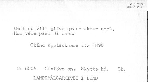 //// JS //// Om I nu vill gifva grann akter uppå, Hur.våra pier di dansa //// Okänd upptecknare c:a 1890 //// Nr 6006 Gislövs sn, Skytts hd. Sk. //// LANDSMÅLSARKIVET I LUND ////