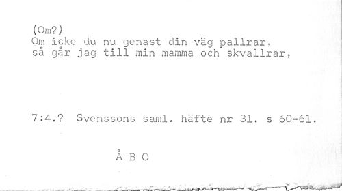 //// (Om?) //// Om Icke du nu genast din väg pallrar, så går jag till min mamma och skvallrar, //// 7:4.? Svenssons saml. häfte nr 31. s 60-61. //// ÅBO //// * , . i . ' T * ¦ ' ^ . V -¦ .. --^ v \ . . wj' ////