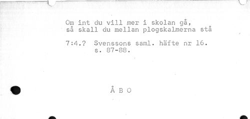 //// Om-int du vill mer i skolan gå, så skall du mellan plogskalmerna stå //// / //// 7:4.? Svenssons saml. häfte nr 16. //// s. 87-88. ////