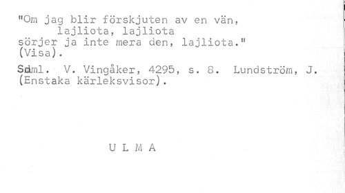 //// "Om jag blir förskjuten av en vän, //// lajliota, lajliota sörjer ja inte mera den, lajliota." (Visa). //// Siäml. V. Vingåker, 4295, s. 8. Lundström, J. (bnstaka kärleksvisor). //// U L Ivi A ////