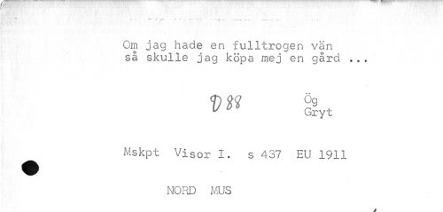 //// «• * - - --- - — r - — - - - //// Om jag hade en fulltrogen vän så skulle jag köpa mej en gård ... //// / //// v n ö9 //// y 0 Gryt //// Mskpt Visor I. s 437 EU 1911 //// NORD MUS //// ii ////