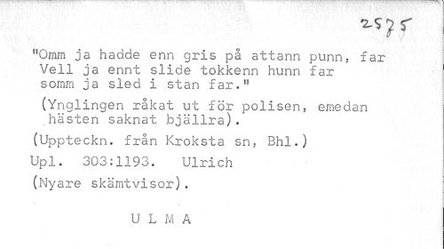 //// f,Omm ja hadde enn gris på attann punn, far Vell ja ennt slide tokkenn hunn far somm ja sled i stan far." //// (Yngl //// ingen rakat ut för polisen, emedan j //// hästen saknat bjällra). //// (Uppteckn. från Kroksta sn, Bhl.) //// Upl. 303:1193. Ulrich //// (Nyare skämtvisor). //// v //// U L M A ////