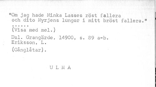 //// f,0m jag hade Minka Lasses röst fallera och dito Myrjens lungor i mitt bröst fallera." //// (Visa med mel.) //// Dal. Grangärde, 14900, s. 89 a-b. Eriksson, L. //// (Gånglåtar). //// U L M A | ////