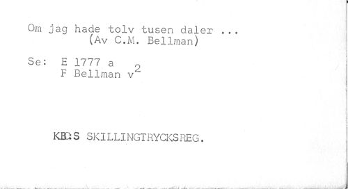 //// Om jag hade tolv tusen daler ... //// (Av C.M. Bellman) //// Se: E 1777 a ? //// F Bellman v~ //// kei s SKILLINGTRYCKS REG. ////