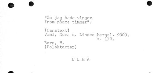//// "Om jag hade vingar Inom nagra timmar". //// (Danstext) //// Vrml, Nora o. Lindes bergsl. 9909, //// s. 113. //// Bore, E. (Polsktexter) //// U L M A ////