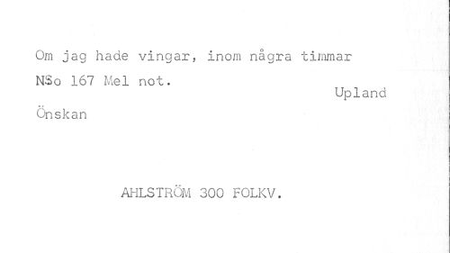 //// Om jag hade vingar, inom några timmar NSo 167 Mel not. //// Upland //// c o //// Önskan //// AHLSTRÖM 300 FOLKV. //// » ////