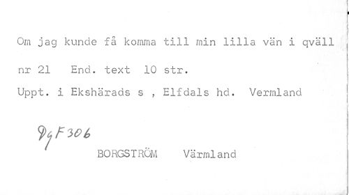 //// i //// Om jag kunde få komma till min lilla vän i qväll nr 21 End. text 10 str. //// ¦ //// Uppt. i Ekshärads s , Elfdals hd. Vermland //// BORGSTRÖM Värmland ////