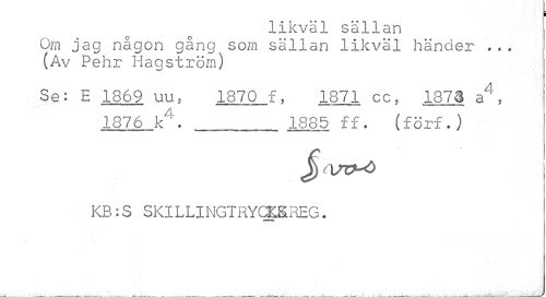 //// I //// likväl sällan Om jag någon gång som sällan likväl händer ... (Av Pehr Hagström) //// Se: H 1669 uu, 1870 f, 1871 cc, 1873 a4, //// 1876 k4.___ 1885 ff. (förf.) //// J) //// KB: S SKILLINGTRYCK&REG. ////