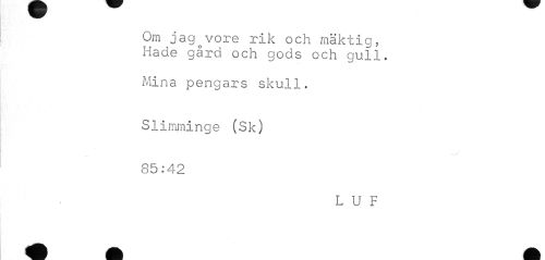 //// Om jagovore rik och mäktig, Hade gård och gods och gull. //// Mina pengars skull. Slimminge (Sk) 85:42 //// L U F ////