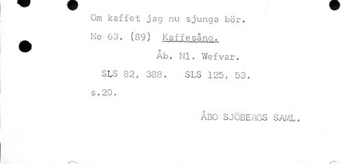 //// Om kaffet jag nu sjunga bör. No 63. (89) Kaffesåna. //// ^^^^ ^ * trnmmmmmm rnrnmmmm mummmmrn mmmrn¦ mrnrnmmmmm ¦ m //// Åb. NI. Wefvar. SLS 82, 388. SLS 125, 53. s. 20. //// ÅBO SJÖBERGS SAML. ////