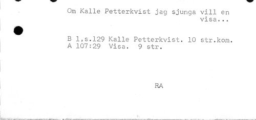//// Om Kalle Petterkvist jag sjunga vill en //// visa... //// B 1,s.129 Kalle Petterkvist. 10 str.kom. A 107:29 Visa. 9 str. //// RA ////