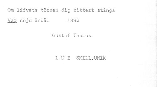 //// Om lifvets törnen dig bittert stinga Var nöjd ändå. 1883 //// Gustaf Thomas LUB SKILL.UNIK //// * //// ¦ //// > ////