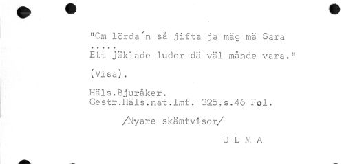 //// ,!0m lörda'n så jifta ja mag mä Sara • • t • • //// Ett jäklade luder dä väl månde vara*fl (Visa). //// Hals.Bjuråker. //// Gestr.Häls.nat.Imf. 325,s.46 Fol. //// /Nyare skämtvisor/ //// U L M A ////
