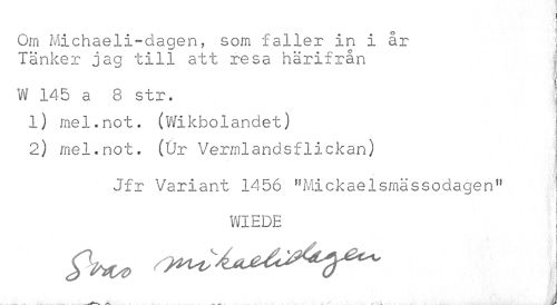 //// i //// r //// Om Michaeli-dagen, som faller in i år //// Tanker jag till att resa häri i rsn •! //// i //// W 145 a 8 str. j //// 1) mel.not. (Wikbolandet) //// 2) mel.not. (Or Vermlandsflickan) //// Jfr Variant 1456 "Mickaelsmässodagen11 //// i //// WIEDE i ////