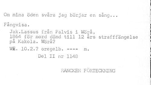 //// I //// Om mina öden svåra jag börjar en sång... //// Fångvisa. j //// Jak.Lassus från Palvis i Wörå, //// 1864 för mord dömd till 12 års strafffängelse //// på Kakola. Wörå? * //// W£. 10.2.? oregelb. --- m. //// Del II nr 1148 | //// RANCKEN FÖRTECKNING ////
