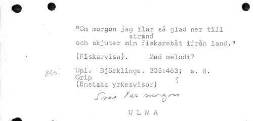 //// "Om morgon jag ilar så glad ner till //// strand //// och skjuter min fiskarebåt ifrån land." //// (Fiskarvisa). Med melodi? //// Upl. Björklinge, 303: 463; s. 8. c 'Grip -z //// (Enstaka yrkesvisor) //// U L M A ////