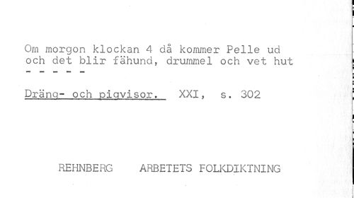 //// I //// I //// Om morgon klockan 4 då kommer Pelle ud //// och det blir fähund, drummel och vet hut ! //// I //// Dräng- och pjgvisor. XXI, s. 302 : //// i ¦ //// i //// i //// m //// REHNBERG ARBETETS FOLKDIKTNING //// i ////
