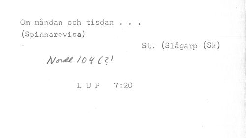 //// Om måndan och tisdan . . . //// (Spinnarevisa) //// St. (Slågarp (Sk) //// A/<ru£l /ÖV C V //// LUF 7:20 ////