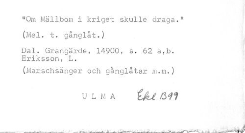 //// "Om Mallbom i kriget skulle draga." //// (Mel. t. gånglåt.) //// Dal. Grangärde, 14900, s. 62 a,b. Eriksson, L. //// (Marschsånger och gånglåtar rn.m.) //// U L M A tAl ////