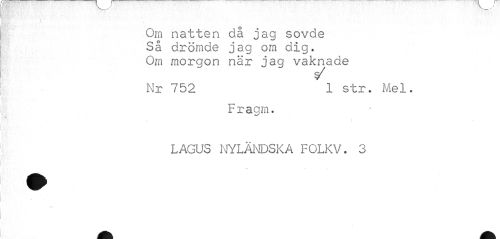 //// i\Xl('f ¦ ' \ //// I //// Om natten då jag sövde Så drömde jag om dig. Om morgon när jag vaknade //// Nr 752 1 str. Mel. //// Fragm. //// \ //// LAGUS NYLÄNDSKA FOLKV. 3 ////