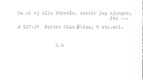 //// Om ni ej alla förstår, varför jag sjunger, //// jag . .. //// A 517:37 Petter Olas §/visa, 5 str.mel. //// R A ////