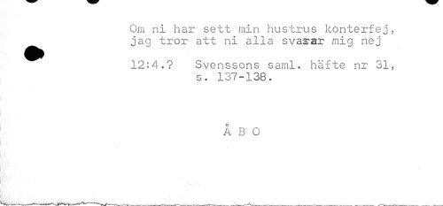 //// Om ni har sett min hustrus konterfej, jag tror att ni alla svajar mig nej //// 12:4.? Svenssons saml. häfte nr 31, //// s. 137-138. //// ÅBO ////