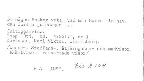 //// ! //// Om någon önskar veta, vad min Herre mig gav, //// den första juledagen ... : //// Jultiggarvisa. //// Insp. Rtj. bd. 47231:1, nr 1 ; //// Karlsson, Karl Viktor, Ulriksberg. I //// /Lusse-, Staffans-, Stjärngosse- och majvisor, skämtvisor, rarnsartade visor/ //// RA INSP. ////