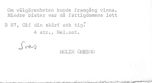 //// Om välgörenheten kunde framgång vinna, Mindre bister var då fattigdomens lott //// B 87, Gif din skärf och tig.' //// 4 str., Mel.not. //// MOLIN ÖREBRO ---_---——---. _. ___&... ////