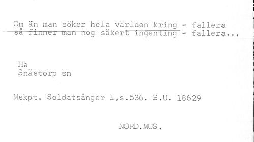 //// Om än man söker hela världen kring - fallera -så finner man nog säkert ingenting - fallera... //// Ha //// Snästorp sn //// i //// Mskpt. Soldatsånger I,s.536. E.U. 18629 //// NORD.MUS. ////