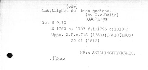 //// (vår) //// Ombytlighet du tids gudinna... //// (Av"O^v.Dalin) //// Aj A »ii: //// Se: B 9,10 ' //// E 1763 a; 1787 £,i;1796 c;1810 j, Upps. Z.P.s.7:8 (1768);13:13(1805) //// 22:41 (1812) //// ^ KB:s SKILLINGTRYCKSREG. . ////