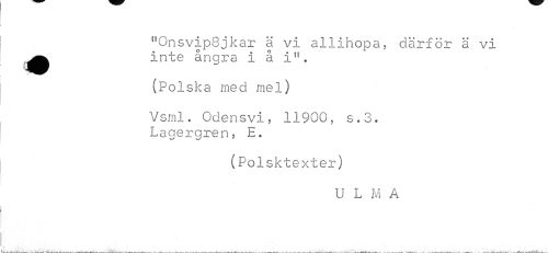 //// "OnsvipSjkar ä vi allihopa, därför ä vi //// •inte ångra i å i". //// wr //// (Polska med mel) //// Vsml. Odensvi, 11900, s.3. Lagergren, E. //// (Polsk texter) //// U L M A ////