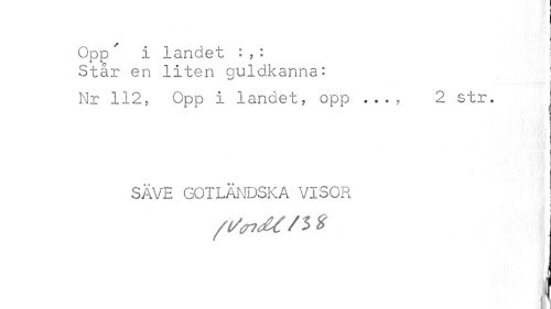 //// I //// r //// t i //// / S //// Opp i landet : , : j //// Står en liten guldkanna: } //// Nr 112, Opp i landet, opp . 2 str. //// r //// l | //// t 1 //// I //// 1 //// SÄVE GOTLÄNDSKA VISOR //// l //// ¦Jm p //// n ////