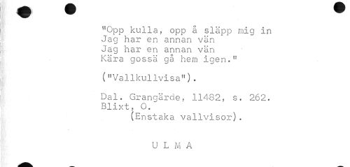 //// "Opp kulla, opp å släpp mig in Jag har en annan vän Jag har en annan vän Kära gossä gå hem Igen." //// ("Vallkullvisa"). //// Dal. Grangärde, 11482, s. 262. Blixt, 0. //// (Enstaka vallvisor). //// v //// U L M A ////