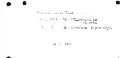 //// Opp och dansa Sara . ... . //// Lekt, 1941. Så. Hälleberga sn. //// Målerås. //// n n Sm. Orrefors. Sigislaryd. //// / //// NORD MUS ////