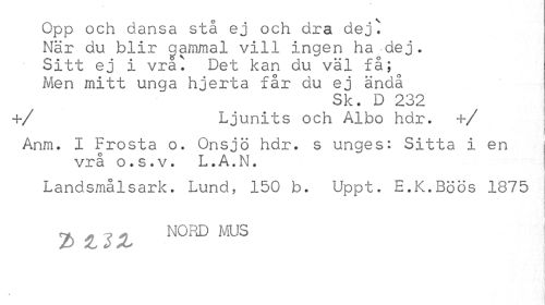 //// Opp och dansa stå ej och dra dej. //// När du blir gammal vill ingen ha-dej. Sitt ej i vra^ Det kan du väl få; Men mitt unga hjerta får du ej ändå //// Sk. D 232 //// +/ Ljunits och Albo hdr. +/ //// Anm. I Frosta o. Onsjö hdr. s unges: Sitta i en //// vrå o.s.v. L.A.N. //// Landsmålsark. Lund, 150 b. Uppt. E.K.Böös 1875 //// | //// r* „ ? >, nord mus //// > ////