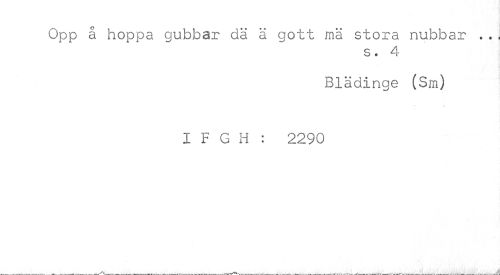 //// Opp å hoppa gubbar dä ä gott mä stora nubbar ... //// s. 4 //// Blädinge (Sm) //// I F G H : 2290 //// '! ' " " "" ' —---.Uw^x—^s,.^---r---..vrvV^v^w^.,™,.^...,-v___---i'i ////