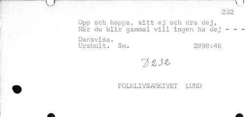 //// 232 //// Opp och hoppa, sitt ej och clra dej, //// När du blir gammal vill ingen ha dej - - - //// Dansvisa. //// Urshult. Srn. 2898:46 //// ^ FOLKLIVSARKIVET LUND ////