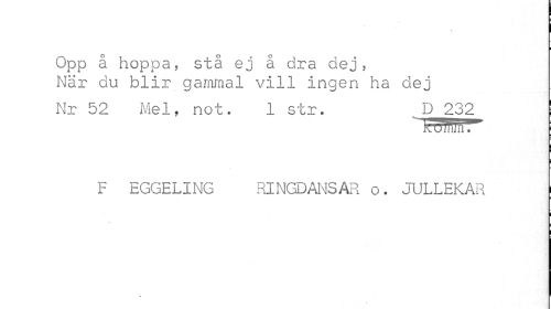 //// Opp å hoppa, stå ej å dra dej, När du blir gammal vill ingen ha dej //// Nr 52 Mel, not. 1 str. _ //// F EGGELING RINGDANSAR o. JULLEKAR i //// ¦ //// i //// ¦ ////