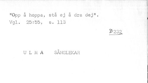 //// uOpp å hoppa, stå ej å dra deju. Vgl. 25:55, s. 113 //// 2*232 //// ^mmmmmmmmmmmt^"^^ //// U L M A SÅNGLEKAR //// - ////