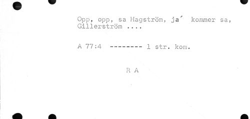 //// Opp, opp, sa Hagströrn, ja' kommer sa, Gillerström ... //// A 77:4 ---1 str- kom. //// R A //// / ////
