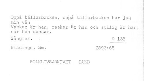 //// Oppå kallarbacken, oppå källarbacken har jag min vän //// Vacker är han, rasker är han och stilig är han, när han dansar. //// Sånglek. . D 138 //// Blädinge, Sm. 2893:65 //// FOLKLIVSARKIVET LUND ////