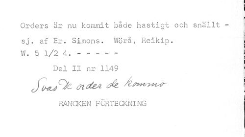 //// I //// Orders är nu kommit både hastigt och snällt - //// sj. af Er. Simons. Wörå, Reikip. i //// W. 5 1/2 4.---| //// Del II nr 1149 i //// i //// RANCKEN FÖRTECKNING //// t ////