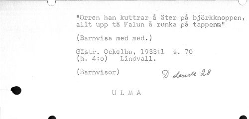 //// "Orren han kuttrar å äter på björkknoppen, allt upp tä Falun å runka på tappemxi11 //// (Barnvisa med med*) //// Gästr• Ockelbo, 1933:1 s. 70 (h. 4:o) Lindvall. //// (Barnvisor) g Jj^tt ////