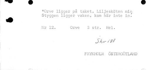 //// "Orve ligger på taket, Liljesköten min ^^ Styggen ligger vaken, kom här inte in.' //// Nr 12. Orve 3 str. Mel. //// SU ni //// t //// F RYKHOLM ÖS TE RGÖTLAND ////