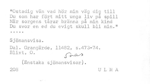 //// "Ostadig vän vad hör min väg dig till Du som har fört mitt unga liv på spill När sorgens tårar bränna på min kind Du svor en ed du evigt skull bli min.n //// Sjömansvisa. //// Dal. Grangärde, 11482, s.473-74. Blixt, O. //// (Enstaka sjömansvisor). //// 208 U L M A ////