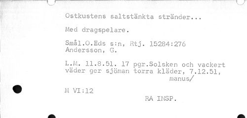 //// Ostkustens saltstänkta stränder... Med dragspelare. //// Smål.O.Eds s:n, Rtj. 15284:276 Andersson, G. //// L.M. 11.8.51. 17 pgr.Solsken och vackert väder ger sjöman torra kläder, 7.12.51, //// manus/ //// ^ RA INSP. ////