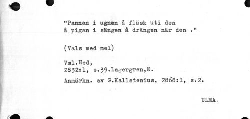 //// "Pannan i ugnen å fläsk uti den å pigan i sängen å drängen när den //// (Vals med mel) //// Yal.Hed, //// 2832:1, s?39*Lagergren,B. //// Ånmärkn. av G.Kallstenius, 2868:1, s.2* //// ULMA, ////