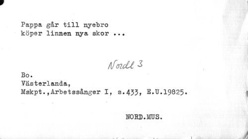 //// Pappa går till nyebro köper linnen nya skor //// hfölctl 3 //// Bo. //// Västerlanda, //// Mskpt.,Arbetssånger I, s.433, E.U.19825. //// NORD. MS. //// A ////
